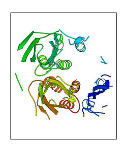 These views are prepared from three orthologuous viewpoints with MolScript. Secondary structures are determined from the C-alpha atom positions of your protein (N-terminal blue, C-terminal red).