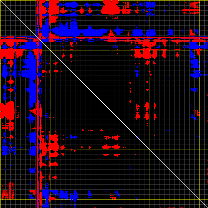This matrix displays the maximum distance fluctuations between all pairs of CA atoms and between the two extreme conformations that were computed for this mode (DQMIN/DQMAX). Distance increases are plotted in blue and decreases in red for the strongest 10% of the residue pair distance changes. Every pixel corresponds to a single residue. Grey lines are drawn every 10 residues, yellow lines every 100 residues (counting from the upper left corner).