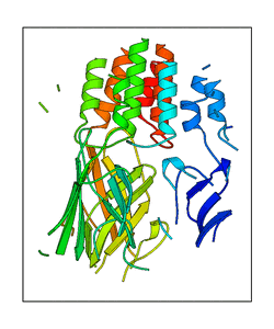 These views are prepared from three orthologuous viewpoints with MolScript. Secondary structures are determined from the C-alpha atom positions of your protein (N-terminal blue, C-terminal red).