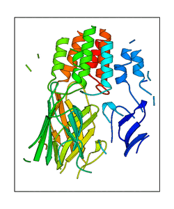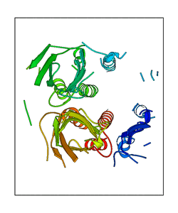These views are prepared from three orthologuous viewpoints with MolScript. Secondary structures are determined from the C-alpha atom positions of your protein (N-terminal blue, C-terminal red).