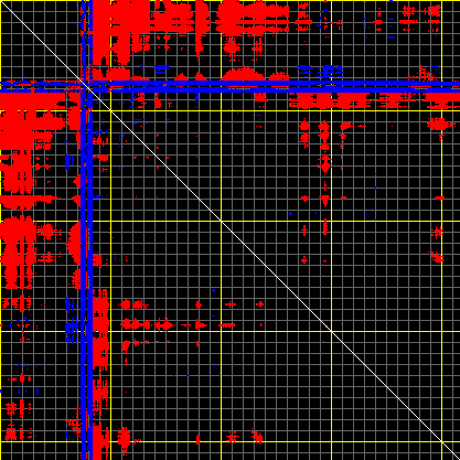 This matrix displays the maximum distance fluctuations between all pairs of CA atoms and between the two extreme conformations that were computed for this mode (DQMIN/DQMAX). Distance increases are plotted in blue and decreases in red for the strongest 10% of the residue pair distance changes. Every pixel corresponds to a single residue. Grey lines are drawn every 10 residues, yellow lines every 100 residues (counting from the upper left corner).