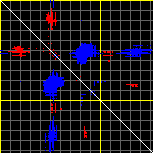 This matrix displays the maximum distance fluctuations between all pairs of CA atoms and between the two extreme conformations that were computed for this mode (DQMIN/DQMAX). Distance increases are plotted in blue and decreases in red for the strongest 10% of the residue pair distance changes. Every pixel corresponds to a single residue. Grey lines are drawn every 10 residues, yellow lines every 100 residues (counting from the upper left corner).