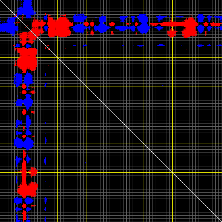 This matrix displays the maximum distance fluctuations between all pairs of CA atoms and between the two extreme conformations that were computed for this mode (DQMIN/DQMAX). Distance increases are plotted in blue and decreases in red for the strongest 10% of the residue pair distance changes. Every pixel corresponds to a single residue. Grey lines are drawn every 10 residues, yellow lines every 100 residues (counting from the upper left corner).