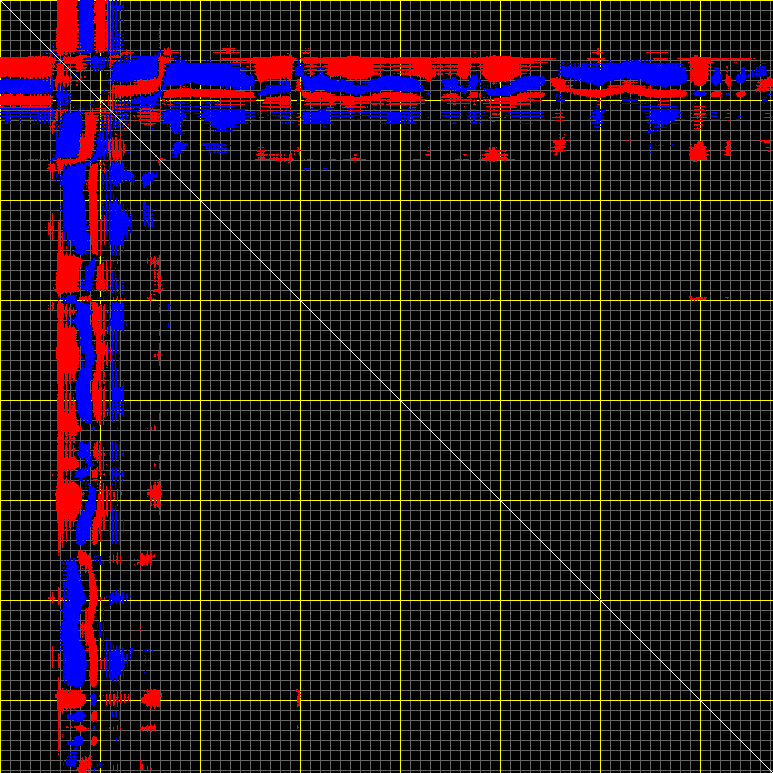 This matrix displays the maximum distance fluctuations between all pairs of CA atoms and between the two extreme conformations that were computed for this mode (DQMIN/DQMAX). Distance increases are plotted in blue and decreases in red for the strongest 10% of the residue pair distance changes. Every pixel corresponds to a single residue. Grey lines are drawn every 10 residues, yellow lines every 100 residues (counting from the upper left corner).