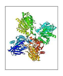 These views are prepared from three orthologuous viewpoints with MolScript. Secondary structures are determined from the C-alpha atom positions of your protein (N-terminal blue, C-terminal red).