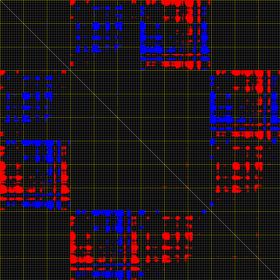 This matrix displays the maximum distance fluctuations between all pairs of CA atoms and between the two extreme conformations that were computed for this mode (DQMIN/DQMAX). Distance increases are plotted in blue and decreases in red for the strongest 10% of the residue pair distance changes. Every pixel corresponds to a single residue. Grey lines are drawn every 10 residues, yellow lines every 100 residues (counting from the upper left corner).