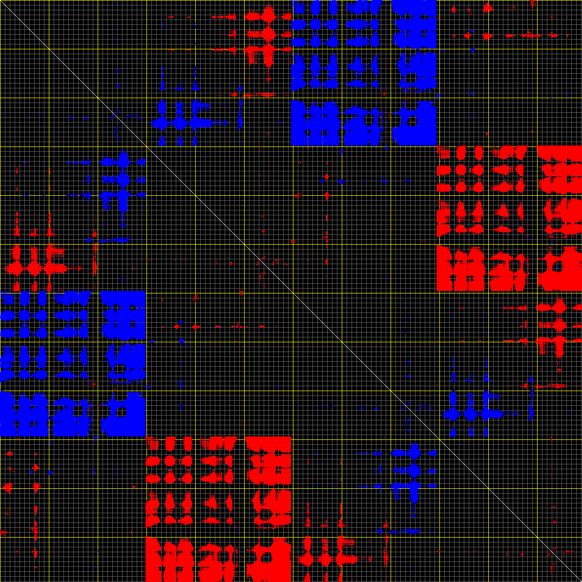 This matrix displays the maximum distance fluctuations between all pairs of CA atoms and between the two extreme conformations that were computed for this mode (DQMIN/DQMAX). Distance increases are plotted in blue and decreases in red for the strongest 10% of the residue pair distance changes. Every pixel corresponds to a single residue. Grey lines are drawn every 10 residues, yellow lines every 100 residues (counting from the upper left corner).