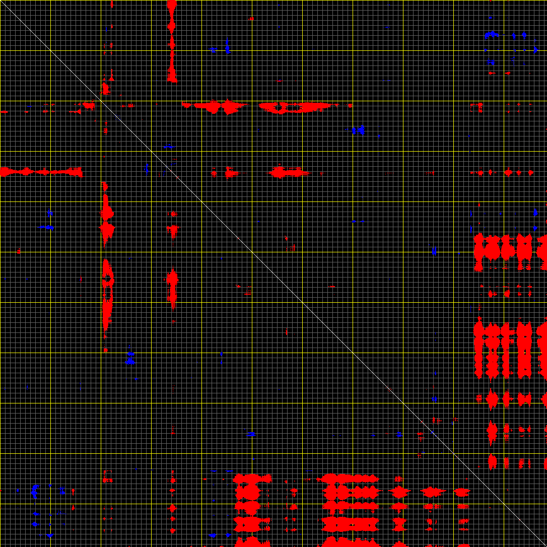 This matrix displays the maximum distance fluctuations between all pairs of CA atoms and between the two extreme conformations that were computed for this mode (DQMIN/DQMAX). Distance increases are plotted in blue and decreases in red for the strongest 10% of the residue pair distance changes. Every pixel corresponds to a single residue. Grey lines are drawn every 10 residues, yellow lines every 100 residues (counting from the upper left corner).