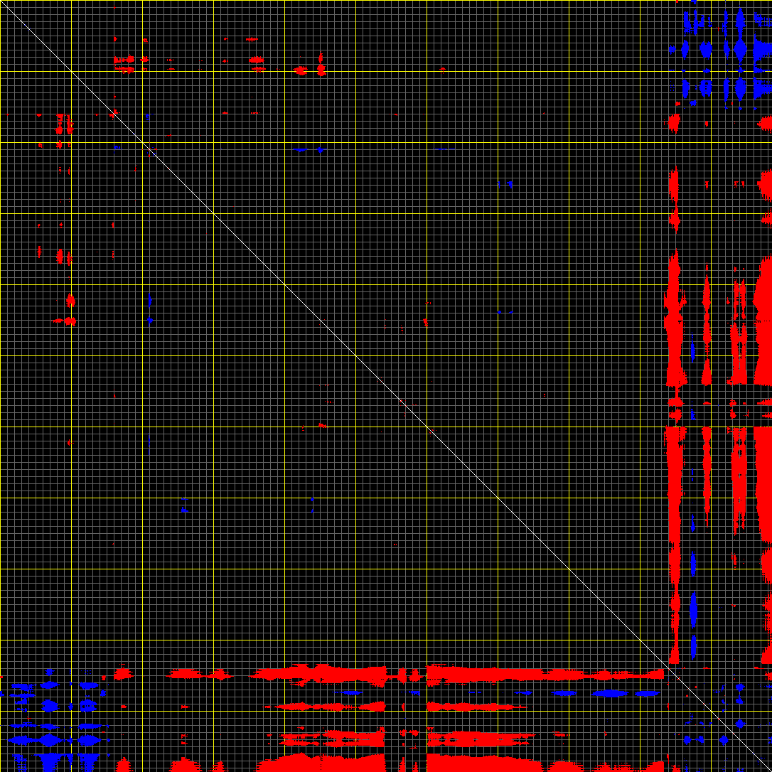 This matrix displays the maximum distance fluctuations between all pairs of CA atoms and between the two extreme conformations that were computed for this mode (DQMIN/DQMAX). Distance increases are plotted in blue and decreases in red for the strongest 10% of the residue pair distance changes. Every pixel corresponds to a single residue. Grey lines are drawn every 10 residues, yellow lines every 100 residues (counting from the upper left corner).