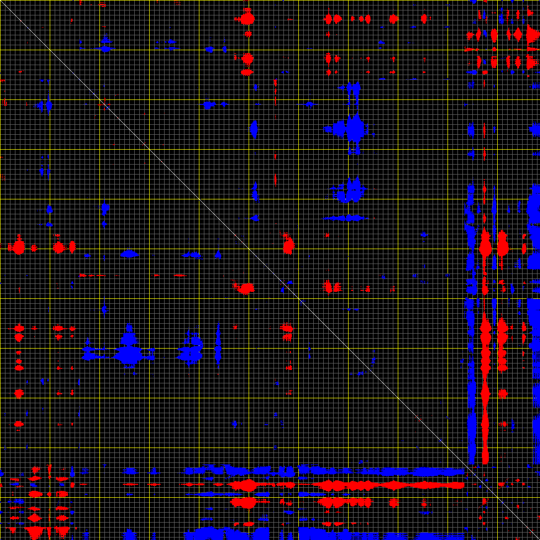 This matrix displays the maximum distance fluctuations between all pairs of CA atoms and between the two extreme conformations that were computed for this mode (DQMIN/DQMAX). Distance increases are plotted in blue and decreases in red for the strongest 10% of the residue pair distance changes. Every pixel corresponds to a single residue. Grey lines are drawn every 10 residues, yellow lines every 100 residues (counting from the upper left corner).