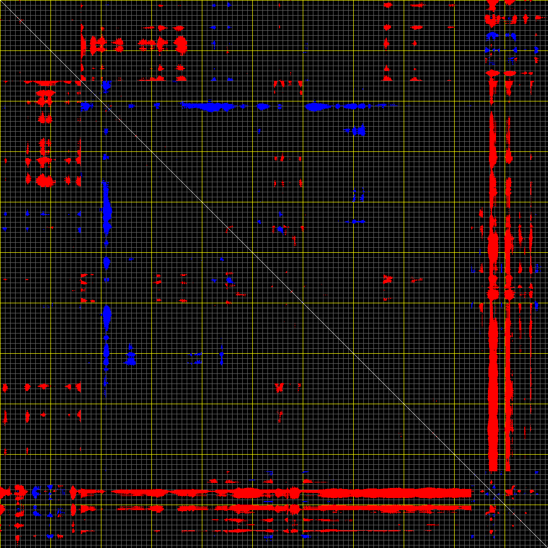 This matrix displays the maximum distance fluctuations between all pairs of CA atoms and between the two extreme conformations that were computed for this mode (DQMIN/DQMAX). Distance increases are plotted in blue and decreases in red for the strongest 10% of the residue pair distance changes. Every pixel corresponds to a single residue. Grey lines are drawn every 10 residues, yellow lines every 100 residues (counting from the upper left corner).