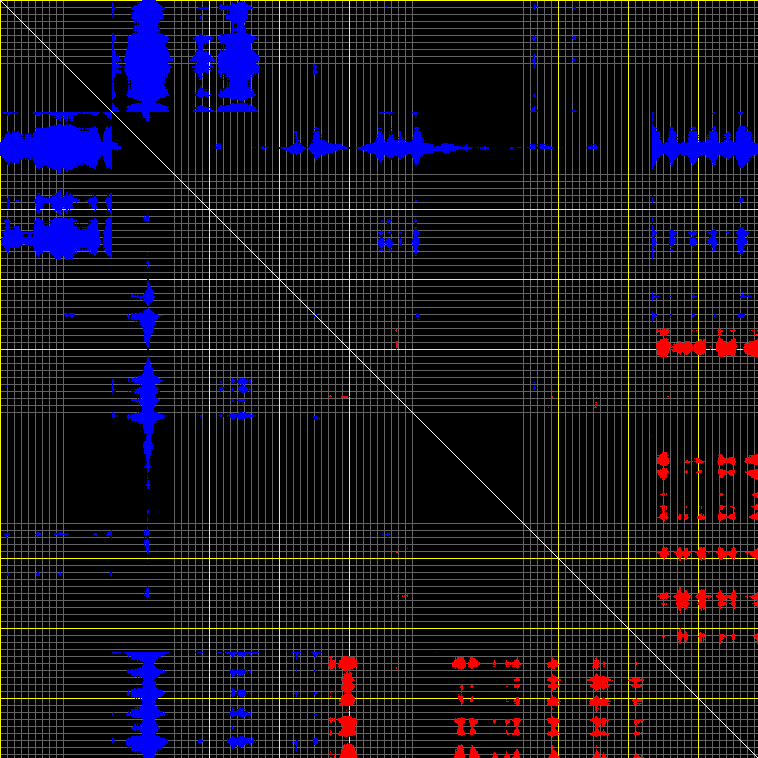 This matrix displays the maximum distance fluctuations between all pairs of CA atoms and between the two extreme conformations that were computed for this mode (DQMIN/DQMAX). Distance increases are plotted in blue and decreases in red for the strongest 10% of the residue pair distance changes. Every pixel corresponds to a single residue. Grey lines are drawn every 10 residues, yellow lines every 100 residues (counting from the upper left corner).