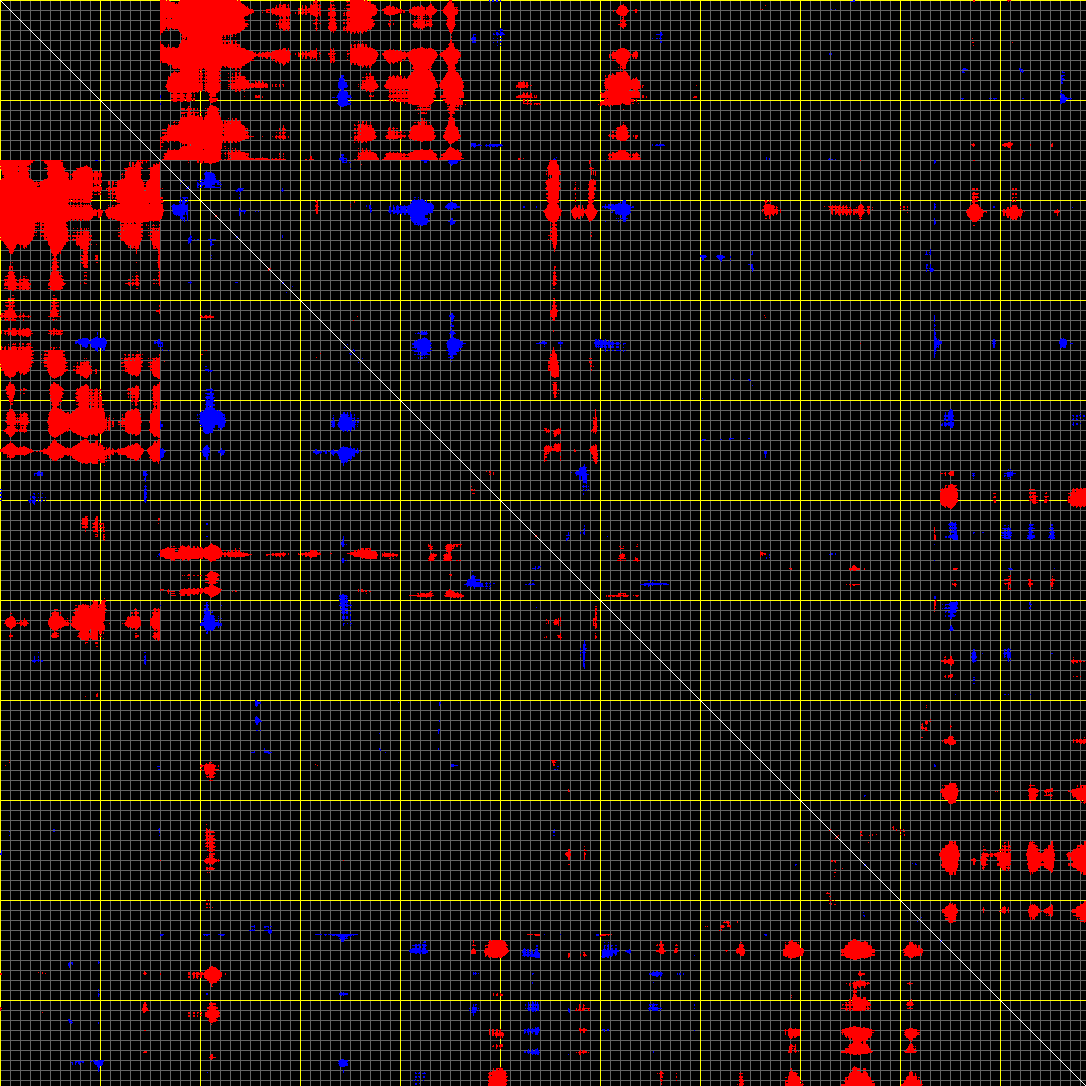 This matrix displays the maximum distance fluctuations between all pairs of CA atoms and between the two extreme conformations that were computed for this mode (DQMIN/DQMAX). Distance increases are plotted in blue and decreases in red for the strongest 10% of the residue pair distance changes. Every pixel corresponds to a single residue. Grey lines are drawn every 10 residues, yellow lines every 100 residues (counting from the upper left corner).