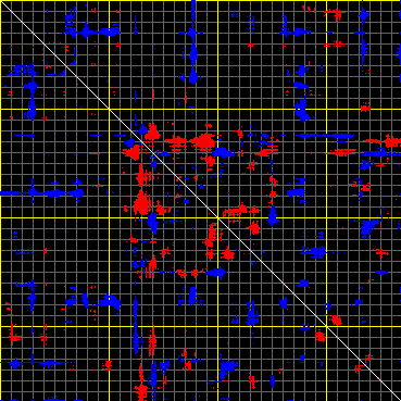 This matrix displays the maximum distance fluctuations between all pairs of CA atoms and between the two extreme conformations that were computed for this mode (DQMIN/DQMAX). Distance increases are plotted in blue and decreases in red for the strongest 10% of the residue pair distance changes. Every pixel corresponds to a single residue. Grey lines are drawn every 10 residues, yellow lines every 100 residues (counting from the upper left corner).
