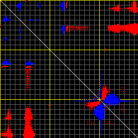 This matrix displays the maximum distance fluctuations between all pairs of CA atoms and between the two extreme conformations that were computed for this mode (DQMIN/DQMAX). Distance increases are plotted in blue and decreases in red for the strongest 10% of the residue pair distance changes. Every pixel corresponds to a single residue. Grey lines are drawn every 10 residues, yellow lines every 100 residues (counting from the upper left corner).
