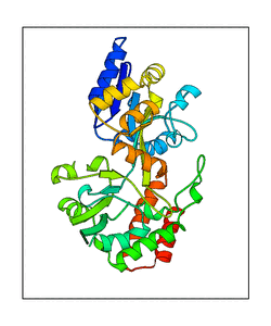 These views are prepared from three orthologuous viewpoints with MolScript. Secondary structures are determined from the C-alpha atom positions of your protein (N-terminal blue, C-terminal red).