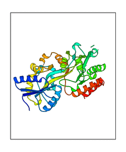 These views are prepared from three orthologuous viewpoints with MolScript. Secondary structures are determined from the C-alpha atom positions of your protein (N-terminal blue, C-terminal red).