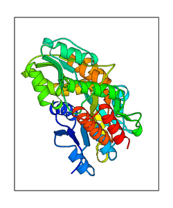 These views are prepared from three orthologuous viewpoints with MolScript. Secondary structures are determined from the C-alpha atom positions of your protein (N-terminal blue, C-terminal red).