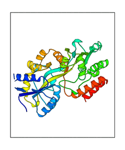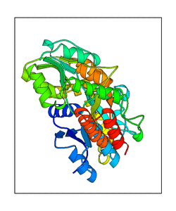 These views are prepared from three orthologuous viewpoints with MolScript. Secondary structures are determined from the C-alpha atom positions of your protein (N-terminal blue, C-terminal red).