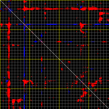 This matrix displays the maximum distance fluctuations between all pairs of CA atoms and between the two extreme conformations that were computed for this mode (DQMIN/DQMAX). Distance increases are plotted in blue and decreases in red for the strongest 10% of the residue pair distance changes. Every pixel corresponds to a single residue. Grey lines are drawn every 10 residues, yellow lines every 100 residues (counting from the upper left corner).