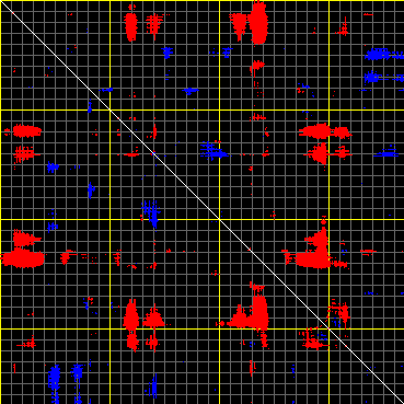 This matrix displays the maximum distance fluctuations between all pairs of CA atoms and between the two extreme conformations that were computed for this mode (DQMIN/DQMAX). Distance increases are plotted in blue and decreases in red for the strongest 10% of the residue pair distance changes. Every pixel corresponds to a single residue. Grey lines are drawn every 10 residues, yellow lines every 100 residues (counting from the upper left corner).
