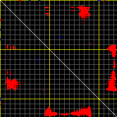 This matrix displays the maximum distance fluctuations between all pairs of CA atoms and between the two extreme conformations that were computed for this mode (DQMIN/DQMAX). Distance increases are plotted in blue and decreases in red for the strongest 10% of the residue pair distance changes. Every pixel corresponds to a single residue. Grey lines are drawn every 10 residues, yellow lines every 100 residues (counting from the upper left corner).