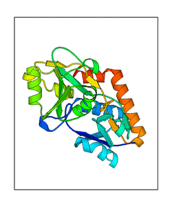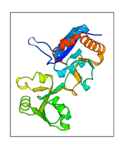These views are prepared from three orthologuous viewpoints with MolScript. Secondary structures are determined from the C-alpha atom positions of your protein (N-terminal blue, C-terminal red).