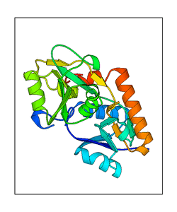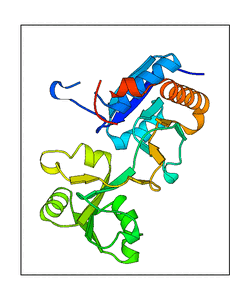 These views are prepared from three orthologuous viewpoints with MolScript. Secondary structures are determined from the C-alpha atom positions of your protein (N-terminal blue, C-terminal red).
