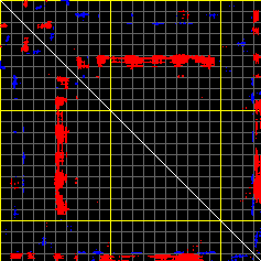 This matrix displays the maximum distance fluctuations between all pairs of CA atoms and between the two extreme conformations that were computed for this mode (DQMIN/DQMAX). Distance increases are plotted in blue and decreases in red for the strongest 10% of the residue pair distance changes. Every pixel corresponds to a single residue. Grey lines are drawn every 10 residues, yellow lines every 100 residues (counting from the upper left corner).