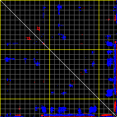 This matrix displays the maximum distance fluctuations between all pairs of CA atoms and between the two extreme conformations that were computed for this mode (DQMIN/DQMAX). Distance increases are plotted in blue and decreases in red for the strongest 10% of the residue pair distance changes. Every pixel corresponds to a single residue. Grey lines are drawn every 10 residues, yellow lines every 100 residues (counting from the upper left corner).