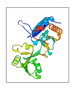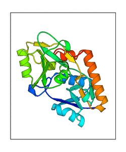These views are prepared from three orthologuous viewpoints with MolScript. Secondary structures are determined from the C-alpha atom positions of your protein (N-terminal blue, C-terminal red).