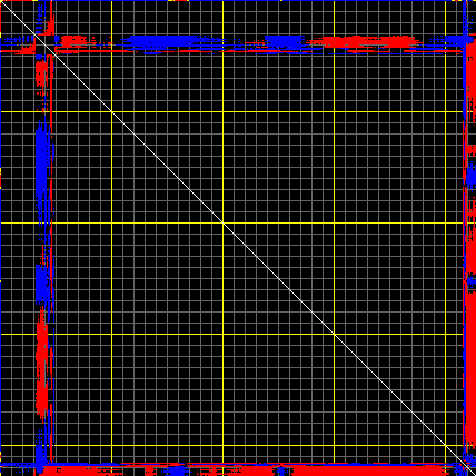 This matrix displays the maximum distance fluctuations between all pairs of CA atoms and between the two extreme conformations that were computed for this mode (DQMIN/DQMAX). Distance increases are plotted in blue and decreases in red for the strongest 10% of the residue pair distance changes. Every pixel corresponds to a single residue. Grey lines are drawn every 10 residues, yellow lines every 100 residues (counting from the upper left corner).