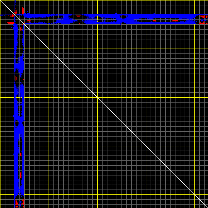 This matrix displays the maximum distance fluctuations between all pairs of CA atoms and between the two extreme conformations that were computed for this mode (DQMIN/DQMAX). Distance increases are plotted in blue and decreases in red for the strongest 10% of the residue pair distance changes. Every pixel corresponds to a single residue. Grey lines are drawn every 10 residues, yellow lines every 100 residues (counting from the upper left corner).
