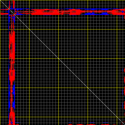 This matrix displays the maximum distance fluctuations between all pairs of CA atoms and between the two extreme conformations that were computed for this mode (DQMIN/DQMAX). Distance increases are plotted in blue and decreases in red for the strongest 10% of the residue pair distance changes. Every pixel corresponds to a single residue. Grey lines are drawn every 10 residues, yellow lines every 100 residues (counting from the upper left corner).