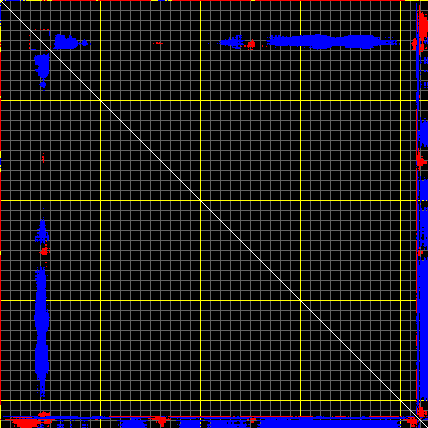 This matrix displays the maximum distance fluctuations between all pairs of CA atoms and between the two extreme conformations that were computed for this mode (DQMIN/DQMAX). Distance increases are plotted in blue and decreases in red for the strongest 10% of the residue pair distance changes. Every pixel corresponds to a single residue. Grey lines are drawn every 10 residues, yellow lines every 100 residues (counting from the upper left corner).