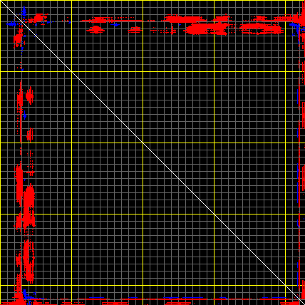 This matrix displays the maximum distance fluctuations between all pairs of CA atoms and between the two extreme conformations that were computed for this mode (DQMIN/DQMAX). Distance increases are plotted in blue and decreases in red for the strongest 10% of the residue pair distance changes. Every pixel corresponds to a single residue. Grey lines are drawn every 10 residues, yellow lines every 100 residues (counting from the upper left corner).