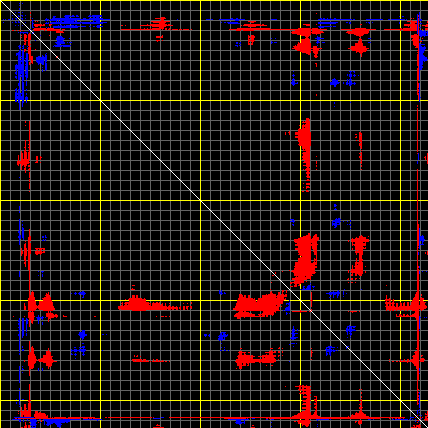 This matrix displays the maximum distance fluctuations between all pairs of CA atoms and between the two extreme conformations that were computed for this mode (DQMIN/DQMAX). Distance increases are plotted in blue and decreases in red for the strongest 10% of the residue pair distance changes. Every pixel corresponds to a single residue. Grey lines are drawn every 10 residues, yellow lines every 100 residues (counting from the upper left corner).