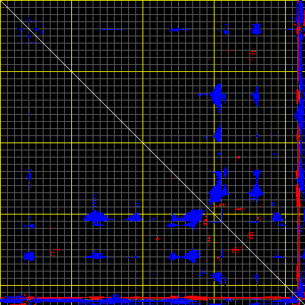 This matrix displays the maximum distance fluctuations between all pairs of CA atoms and between the two extreme conformations that were computed for this mode (DQMIN/DQMAX). Distance increases are plotted in blue and decreases in red for the strongest 10% of the residue pair distance changes. Every pixel corresponds to a single residue. Grey lines are drawn every 10 residues, yellow lines every 100 residues (counting from the upper left corner).