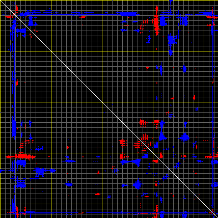 This matrix displays the maximum distance fluctuations between all pairs of CA atoms and between the two extreme conformations that were computed for this mode (DQMIN/DQMAX). Distance increases are plotted in blue and decreases in red for the strongest 10% of the residue pair distance changes. Every pixel corresponds to a single residue. Grey lines are drawn every 10 residues, yellow lines every 100 residues (counting from the upper left corner).