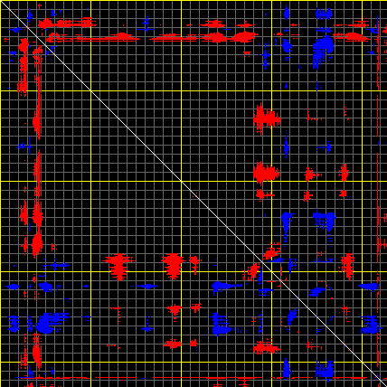 This matrix displays the maximum distance fluctuations between all pairs of CA atoms and between the two extreme conformations that were computed for this mode (DQMIN/DQMAX). Distance increases are plotted in blue and decreases in red for the strongest 10% of the residue pair distance changes. Every pixel corresponds to a single residue. Grey lines are drawn every 10 residues, yellow lines every 100 residues (counting from the upper left corner).