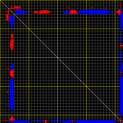 This matrix displays the maximum distance fluctuations between all pairs of CA atoms and between the two extreme conformations that were computed for this mode (DQMIN/DQMAX). Distance increases are plotted in blue and decreases in red for the strongest 10% of the residue pair distance changes. Every pixel corresponds to a single residue. Grey lines are drawn every 10 residues, yellow lines every 100 residues (counting from the upper left corner).