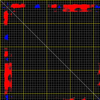 This matrix displays the maximum distance fluctuations between all pairs of CA atoms and between the two extreme conformations that were computed for this mode (DQMIN/DQMAX). Distance increases are plotted in blue and decreases in red for the strongest 10% of the residue pair distance changes. Every pixel corresponds to a single residue. Grey lines are drawn every 10 residues, yellow lines every 100 residues (counting from the upper left corner).