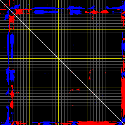 This matrix displays the maximum distance fluctuations between all pairs of CA atoms and between the two extreme conformations that were computed for this mode (DQMIN/DQMAX). Distance increases are plotted in blue and decreases in red for the strongest 10% of the residue pair distance changes. Every pixel corresponds to a single residue. Grey lines are drawn every 10 residues, yellow lines every 100 residues (counting from the upper left corner).