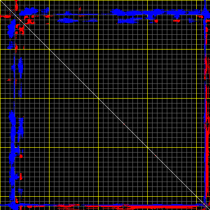 This matrix displays the maximum distance fluctuations between all pairs of CA atoms and between the two extreme conformations that were computed for this mode (DQMIN/DQMAX). Distance increases are plotted in blue and decreases in red for the strongest 10% of the residue pair distance changes. Every pixel corresponds to a single residue. Grey lines are drawn every 10 residues, yellow lines every 100 residues (counting from the upper left corner).