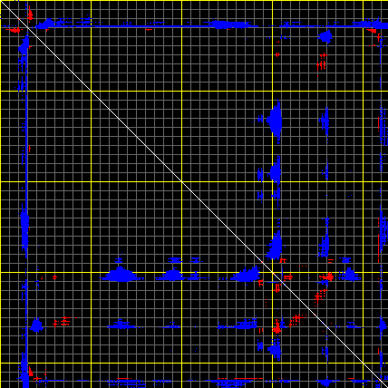 This matrix displays the maximum distance fluctuations between all pairs of CA atoms and between the two extreme conformations that were computed for this mode (DQMIN/DQMAX). Distance increases are plotted in blue and decreases in red for the strongest 10% of the residue pair distance changes. Every pixel corresponds to a single residue. Grey lines are drawn every 10 residues, yellow lines every 100 residues (counting from the upper left corner).