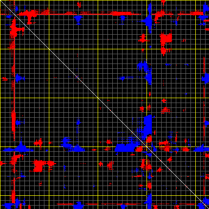 This matrix displays the maximum distance fluctuations between all pairs of CA atoms and between the two extreme conformations that were computed for this mode (DQMIN/DQMAX). Distance increases are plotted in blue and decreases in red for the strongest 10% of the residue pair distance changes. Every pixel corresponds to a single residue. Grey lines are drawn every 10 residues, yellow lines every 100 residues (counting from the upper left corner).
