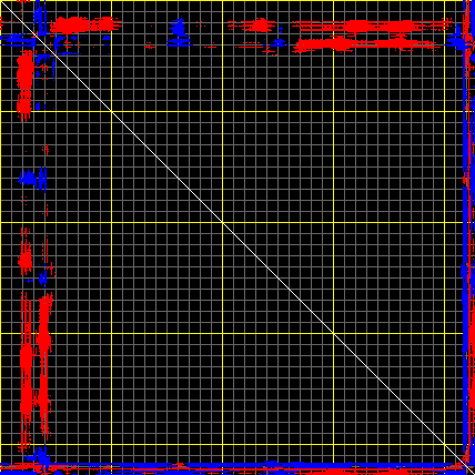 This matrix displays the maximum distance fluctuations between all pairs of CA atoms and between the two extreme conformations that were computed for this mode (DQMIN/DQMAX). Distance increases are plotted in blue and decreases in red for the strongest 10% of the residue pair distance changes. Every pixel corresponds to a single residue. Grey lines are drawn every 10 residues, yellow lines every 100 residues (counting from the upper left corner).