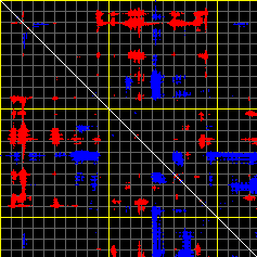 This matrix displays the maximum distance fluctuations between all pairs of CA atoms and between the two extreme conformations that were computed for this mode (DQMIN/DQMAX). Distance increases are plotted in blue and decreases in red for the strongest 10% of the residue pair distance changes. Every pixel corresponds to a single residue. Grey lines are drawn every 10 residues, yellow lines every 100 residues (counting from the upper left corner).