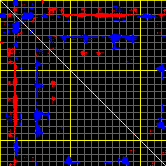 This matrix displays the maximum distance fluctuations between all pairs of CA atoms and between the two extreme conformations that were computed for this mode (DQMIN/DQMAX). Distance increases are plotted in blue and decreases in red for the strongest 10% of the residue pair distance changes. Every pixel corresponds to a single residue. Grey lines are drawn every 10 residues, yellow lines every 100 residues (counting from the upper left corner).