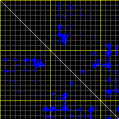 This matrix displays the maximum distance fluctuations between all pairs of CA atoms and between the two extreme conformations that were computed for this mode (DQMIN/DQMAX). Distance increases are plotted in blue and decreases in red for the strongest 10% of the residue pair distance changes. Every pixel corresponds to a single residue. Grey lines are drawn every 10 residues, yellow lines every 100 residues (counting from the upper left corner).